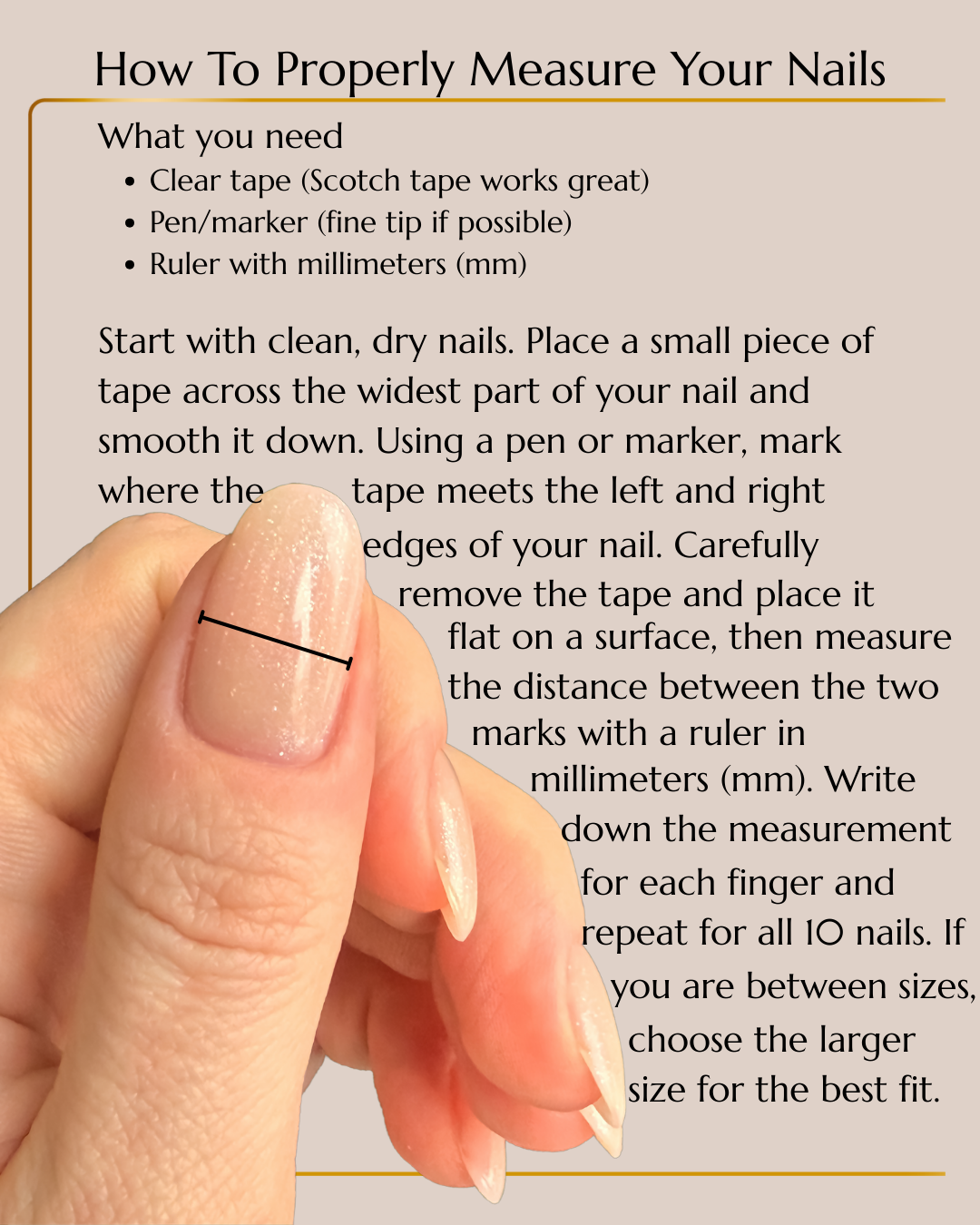 Every Bliss Nails set is crafted for a flawless, natural-looking fit. Our preset size options—Small, Medium, and Large—are based on industry-standard nail widths. Select the size closest to your natural nails for a seamless, custom-feeling application.